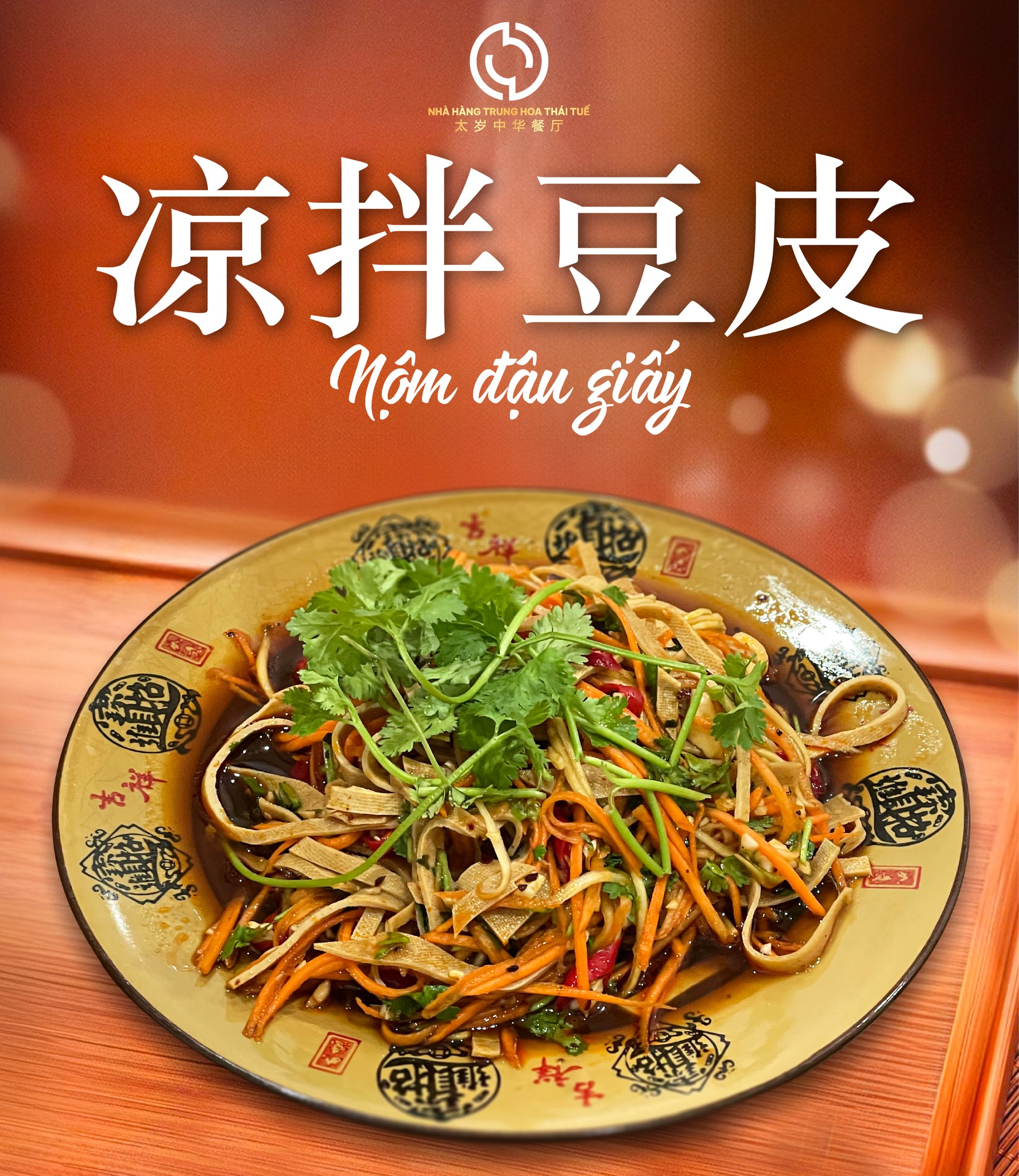 Nộm đậu giấy là món khai vị nổi bật với hương vị thanh mát, kết hợp giữa đậu giấy giòn nhẹ, rau củ và sốt chua ngọt kiểu Hoa. Món ăn mang đến cảm giác tươi mới, kích thích vị giác ngay từ những miếng đầu tiên.